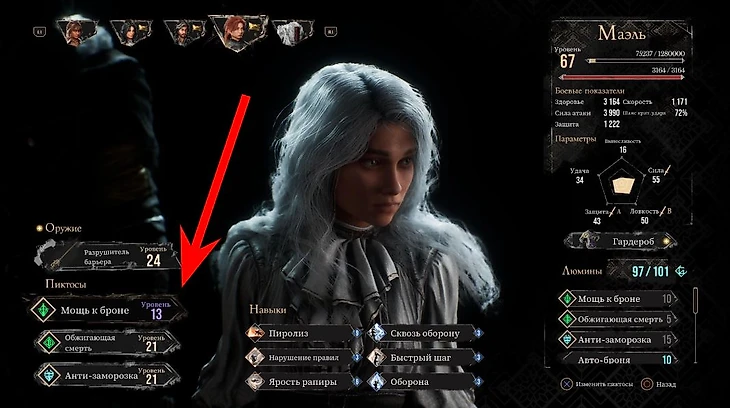 Важно: вы можете в любой момент изменить активные навыки, оружие и пиктосы персонажа. Таким образом, под каждый бой легко собрать отдельный билд, адаптированный под текущие задачи.