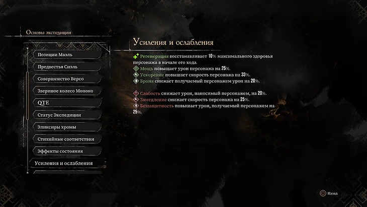 Наложенные состояния отображаются на портрете персонажа или под шкалой здоровья противника. Полный список эффектов вы найдете в меню: «Основы экспедиции» → «Эффекты состояний».