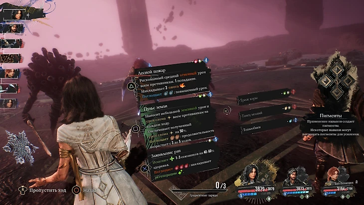 Например, чтобы накопить ОД для более сильной атаки в следующем ходу, имеет смысл в текущем провести обычную атаку. Также можно попытаться парировать выпады врага. Да, риск получить урон выше, но это оправдано, если затем вам потребуется лечение или определенный навык на который нужны ОД.