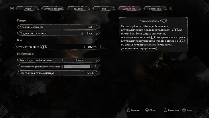 Если устали делать одно и те же сотни раз, включите автоматическое выполнение QTE. Для этого перейдите в Настройки и откройте раздел «Доступность».