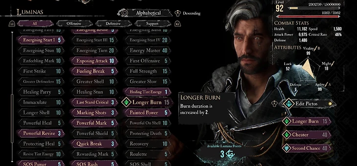 К тому времени, когда персонаж присоединяется к команде, игроки обычно уже знакомы с различными системами усиления. Рекомендуется использовать универсальные Пиктосы, например «Мертвая Энергия» и «Заряженный Старт», которые будут полезны всем героям. Если персонаж полагается на парирование, стоит включить «Усиленный Контрудар» и «Мощный Контрудар» для повышения результативности от ответных атак. Полезно вложить 20 очков Люмина в Пиктос «Уверенность», который повышает степень наносимого урона, однако, лишает возможности восстановления, что делает его рискованным, но эффективным выбором.