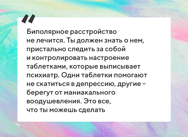 «Трудность в том, что биполярное расстройство не лечится. Ты должен знать о нем, пристально следить за собой и контролировать настроение таблетками, которые выписывает психиатр. Одни таблетки помогают не скатиться в депрессию, другие – берегут от маниакального воодушевления. Это все, что ты можешь сделать».