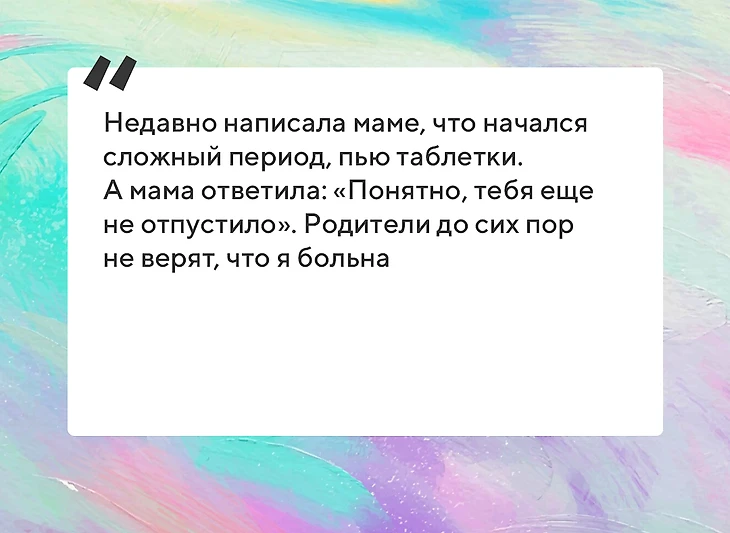«Недавно написала маме, что начался сложный период, пью таблетки. А мама ответила: «Понятно, тебя еще не отпустило». Родители до сих пор не верят, что я больна».