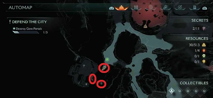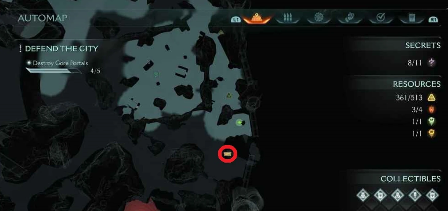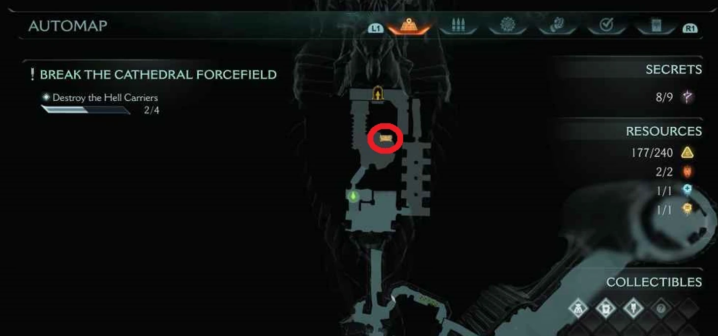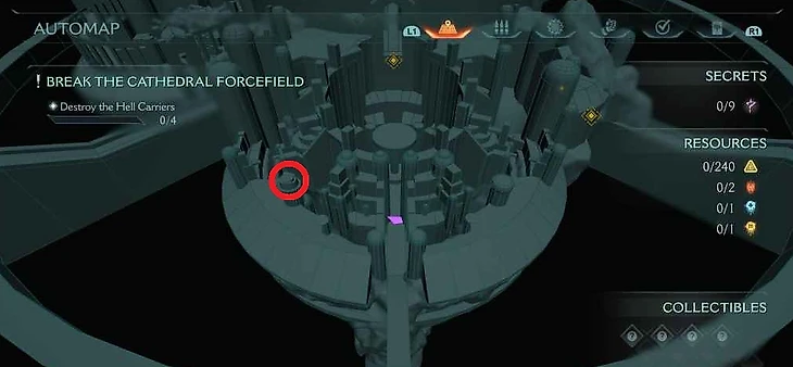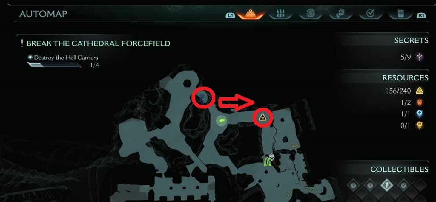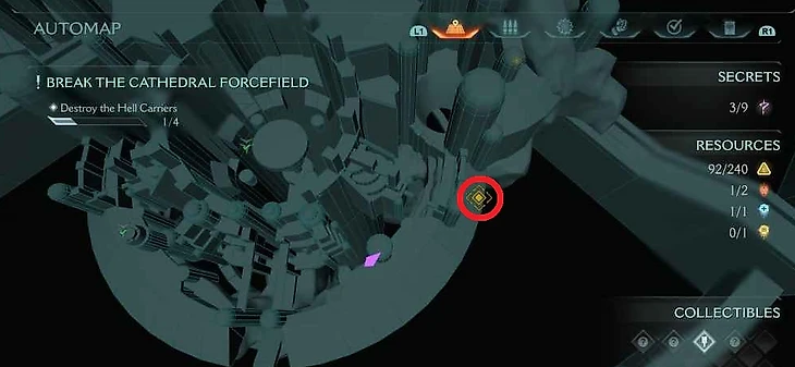 Вы окажетесь на просторной площадке, где предстоит закрыть четыре демонических портала. Двигайтесь по тропинке слева, пока не найдете капсулу с оружием Шреддера — его необходимо подобрать для дальнейшего прохождения. Взяв Шреддер, развернитесь и посмотрите налево: вы увидите площадку для прыжка. Спрыгните туда и подойдите к коллекционному предмету, окруженному барьером. Развернитесь и стреляйте по бочкам, чтобы расправиться с появляющимися демонами и забрать предмет.