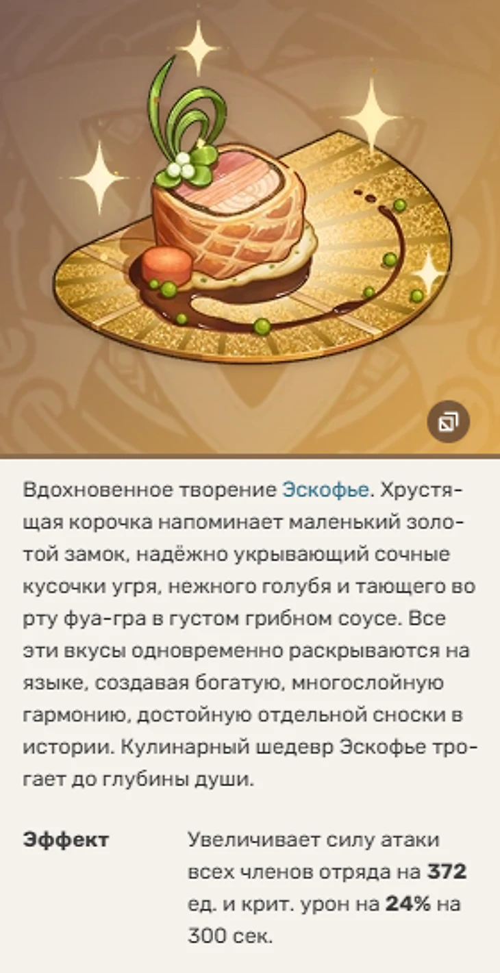 Как получить: удерживайте навык Эскофье, чтобы установить ее Мека. Используйте элементальные атаки на механизме. Когда шкала заполнится, появится одно из уникальных блюд.