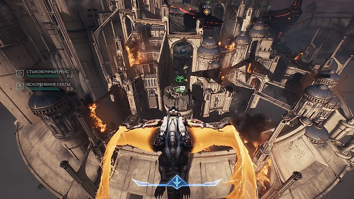Вторая скрытая посадочная площадка расположена в центре открытой локации, прямо под центральным адским транспортником. Чтобы ее найти, направляйтесь к основной квестовой метке, затем летите строго вниз — к нижнему уровню города.