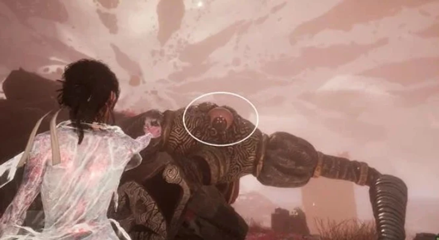Двигайтесь вперед, пока не увидите большую скалу. Чтобы взобраться на нее воспользуйтесь лестницей. На вершине вы увидите акробата с глазом на спине. Это их слабые места – одного точного попадания достаточно, чтобы уничтожить цель.