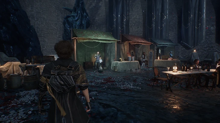 В красной палатке работает Амандина. Она продает предмет, позволяющий сменить прическу Гюставу – волосы убраны назад пучком, сделан радиальный пробор справа.