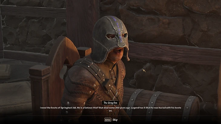 Встретившись с Серым Лисом в Чейдинхоле, ты узнаешь легенду: 300 лет назад умер знаменитый вор Быстроногий Джек, похороненный со своими магическими сапогами. Твоя задача – найти его потомка, графа Джакбена Имбельского, и выведать место захоронения.