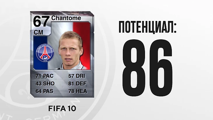 Клеман Шантом – артефакт скромного прошлого «ПСЖ». Французский полузащитник прошел академию и дебютировал за взрослую команду в 18 лет, а в первом же сезоне набрал 20 матчей в Лиге 1. Клеман выходил в центре и на фланге и пригодился основе парижан. Следующие сезоны были похуже, но перед приходом шейхов Шантом снова заиграл в старте. EA регулярно выдавала французу потенциал 86.