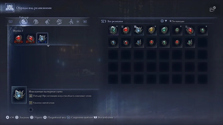 У Уайлдера есть два слота для красных реликвий и один для синих. Красные отвечают за сопротивление урону и повышение стихийных атак, синие – за способности. Точно пригодится синяя реликвия «Изысканная пасмурная сцена», она дополняет перк «Свирепый кол». После применения способности область охватит огонь.