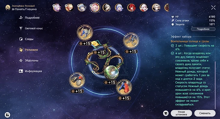 «Воительница солнца и грозы» – сигнатурный сет Гиацины, целительницы пути Памяти. Ей необходимо много скорости, чтобы активировалась пассивка «Спокойствие бури» – за скорость, превышающую 200, ее здоровье и здоровье духа памяти Ики повышаются на 20%, а также дается бонусное исцеление. Поэтому старайтесь выбить как можно больше скорости в сабстатах каждой реликвии.