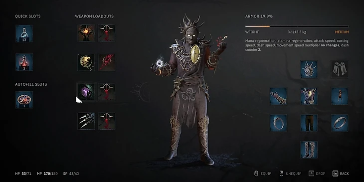 Комплект идеально подойдет для билдов, фокусирующихся на магии крови, проклятиях и дебаффах. Основные свойства брони: