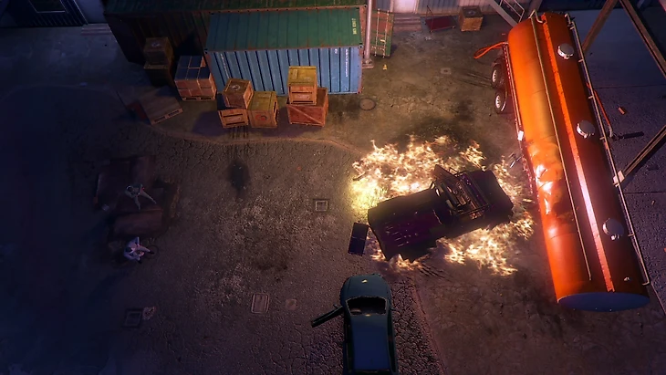 Тревор ранен, вываливается из кабины. Под ним разлито топливо.