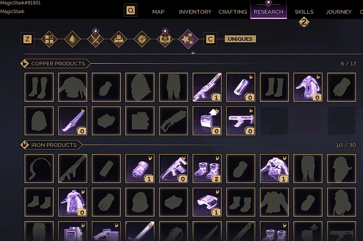 В меню исследования вы можете просматривать необходимые материалы и место, где их можно скрафтить, прежде чем разблокировать рецепт, чтобы сэкономить время и ресурсы.