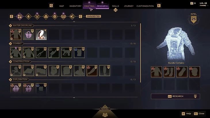 Исследование интеллекта: Вы тратите Интеллект (Intel), который зарабатываете в точках исследования по всему миру, чтобы разблокировать предметы в своем дереве исследований. Прогресс вертикальный: вы начинаете с верхних рядов и разблокируете вниз. Интел, потраченный в одной категории, объединяется глобально, позволяя вам смешивать и сочетать пути (например, оружие и строительство).