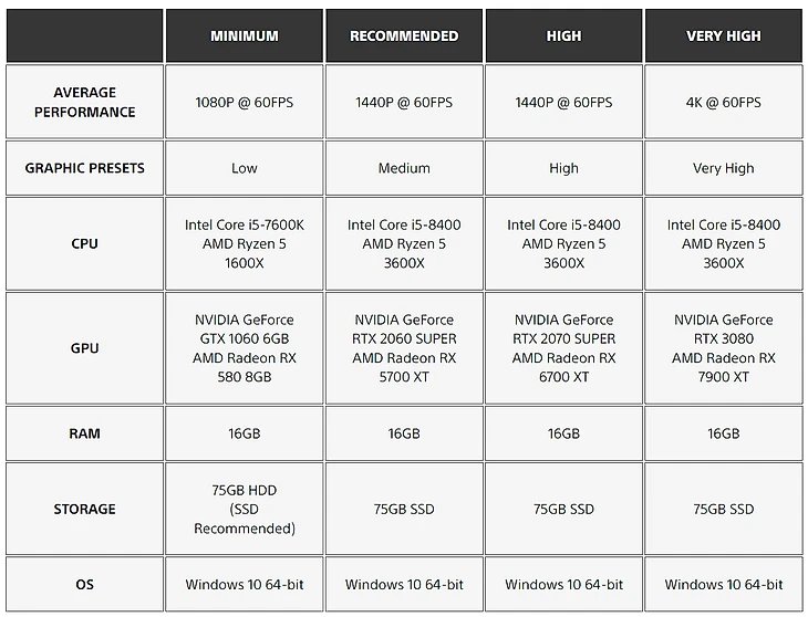 Графическое ядро не должно быть ниже уровня GeForce GTX 1060 с шестью гигабайтами видеопамяти или Radeon RX 580 с восьмью. Для установки потребуется около семидесяти пяти гигабайт свободного пространства, и хотя разработчики не делают жесткого требования, использование твердотельного накопителя явно предпочтительно.