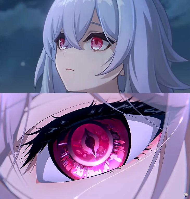 9. Не забыли рассказать и про детство Скирк. Ее родная планета была уничтожена, когда она была ребенком. Кстати, в этом же моменте показано, как изменились ее глаза под воздействием небытия. Такая же ситуация случилась и у Ахерон из Honkai Star Rail – ее значок стал более ромбовидным.