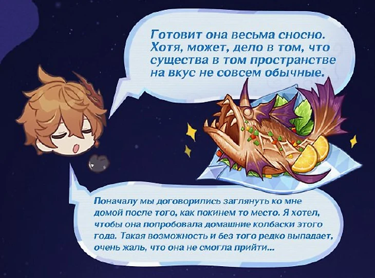 11. Скирк старается держаться от людей подальше, исключение делает только для Тартальи (и для главного героя, которому она разрешила разговаривать на равных). Тарталья звал ее в гости, но она не смогла прийти. На картинке – жуткое особое блюдо Скирк. Хотя, если посмотреть на особое блюдо Тартальи, можно понять, у кого он этому научился.