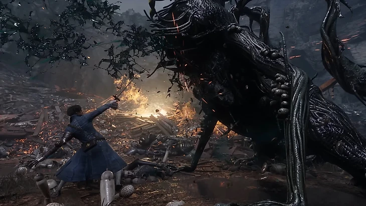Бои очень зрелищные и жестокие, порой такие затянутые, нужно запастись терпением! Боль и страдания нам обеспечены, именно из-за боссов эта игра мне показалась сложнее, чем Dark Souls или тот же Elden Ring. Пытаясь нанести приличный удар, мы нехило огребаем от беспощадных монстров с их яростными атаками, пытаемся что-то предпринимать, пробуем различное оружие, превозмогаем боль и испытываем горечь от поражений. Первые три сражения дались мне очень непросто, было потрачено много времени на то, чтобы понять и прочувствовать «деревянность» боёвки. Ох уж эти атаки с задержками, захваты намертво и мощные АОЕ, которых порой не так-то просто избежать! Да, тайминги бывали кривоваты, не всегда понятны, ты пытаешься бить быстрее и увернуться, но монстр еще быстрее тебя, и в итоге ты ничего не можешь с этим поделать, отлетаешь и начинаешь заново. Благо иногда можно призывать на бой помощника Призрака, - он хоть на какое-то время отвлекает босса.