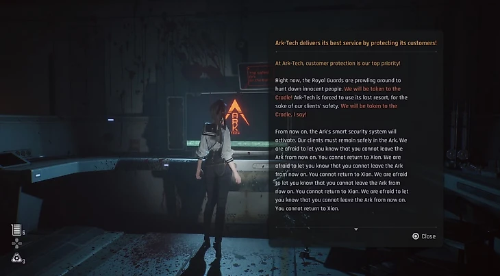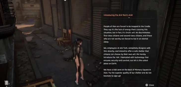 Как только вы примете задание, направляйтесь в северный переулок Ксиона. Там вы увидите запертый сундук. Осмотревшись, вы обнаружите тело повстанца, на котором будет рекламный буклет «Представляем ковчег Ark-Tech!». В этом буклете говорится о безопасном убежище для жителей города. После того как вы изучите записку и осмотрите тело, найдите ближайшую лестницу и поднимитесь по ней. Ваша цель – консоль у ворот ковчега.