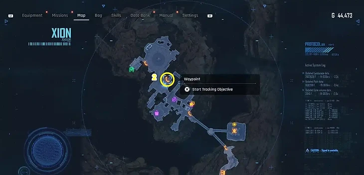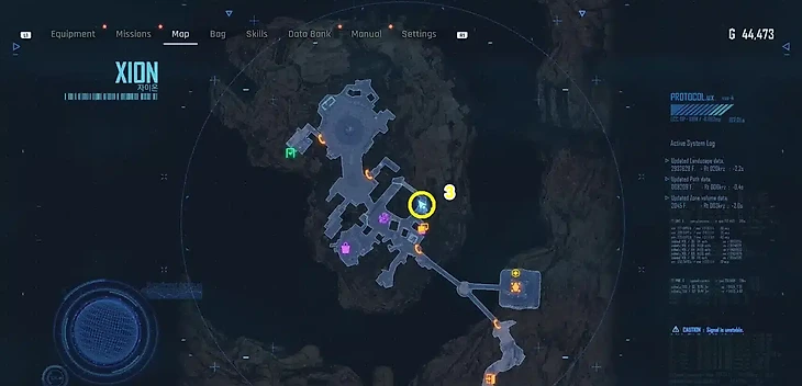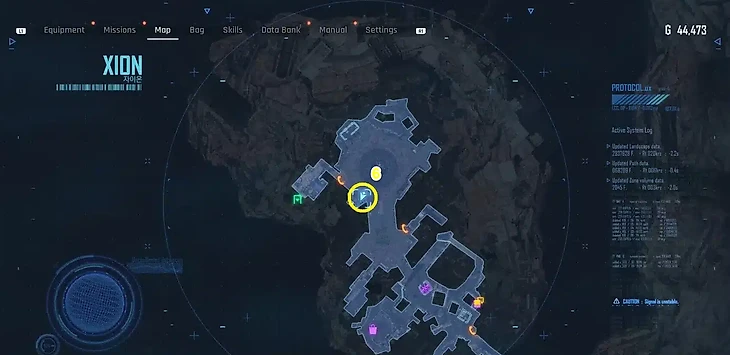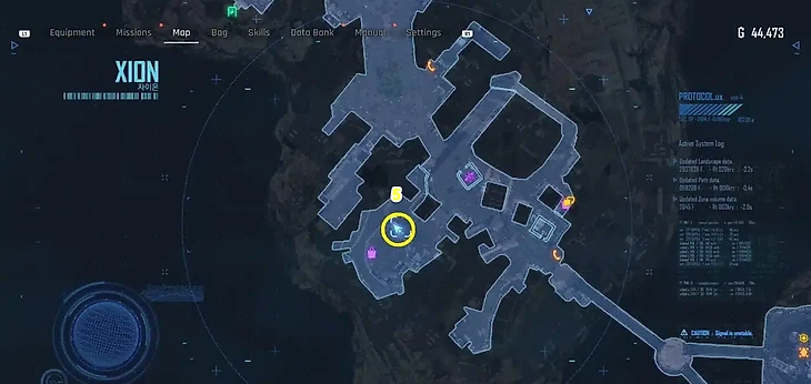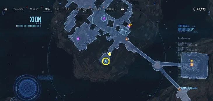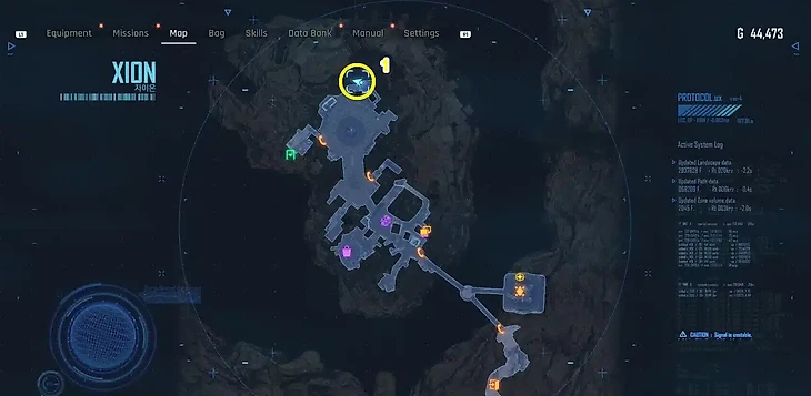 В южной части Ксиона, если идти от магазина и двигаться вперед по переулку, с левой стороны, неподалёку от торговых автоматов. Отображает α (альфа).