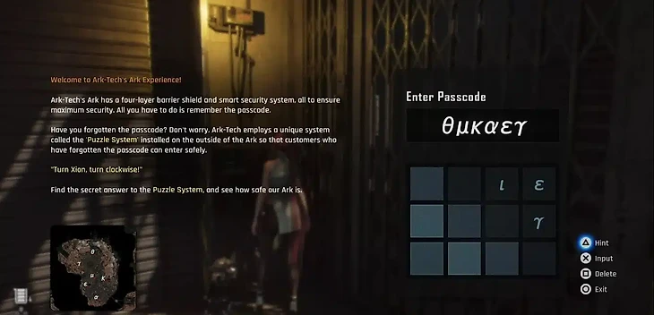 У ворот обнаруживается еще один документ – «Испытайте ковчег Арк-Тека!». В нем содержится загадочная подсказка: «Поверни Ксиона, поверни по часовой стрелке!». Эта информация намекает на последовательность ввода символов пароля, но прежде необходимо отыскать все фрагменты кода. Для этого нужно активировать шесть терминалов, расположенных в разных частях города. Получится пароль – θμκαεγ