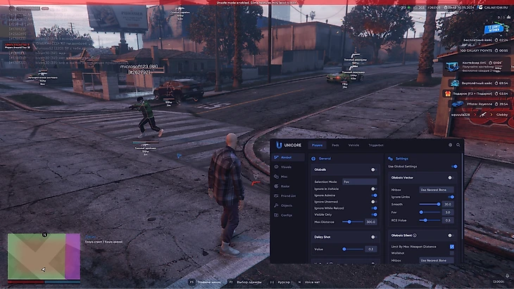 Unicore RageMP – это один из наиболее функциональных и популярных приватных читов для GTA 5 RP, разработанный специально для платформы RageMP. Он предлагает обширный набор инструментов для игроков, стремящихся получить преимущество в игровом процессе, включая визуальные улучшения, аимбот, управление оружием и множество дополнительных функций.
