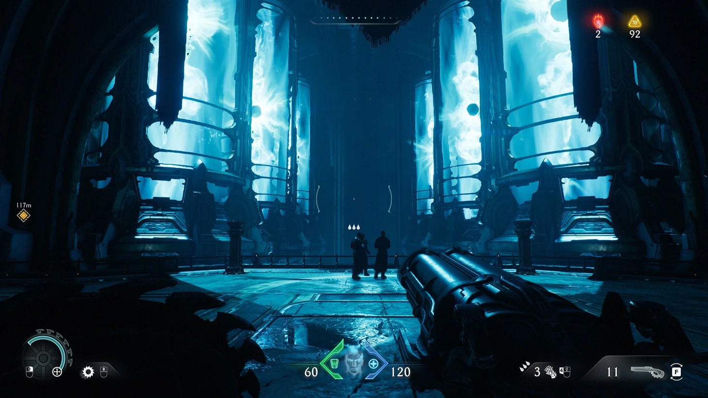 За создание необходимого антуража отвечают дизайн уровней и музыка. Свет, повествование через окружение, голографические постановки – разработчики заморачиваются по поводу каждой детали. Нарративные приемы нацелены на сохранение погружения и не вырывают из потока. Кат-сцены встречаются очень редко и в основном не раздражают. Для Преисподней авторы и вовсе припасли специального рассказчика, который показывает отношение к Палачу со стороны чертей. Подкрепляют любознательность раскиданные по локациям секреты. Многие из них расположены в неочевидных местах и награждают, помимо лора, смешными игрушками, модулями, необходимыми для усиления оружия и костюма, а также ощущением «я самый умный» (додумался же!).