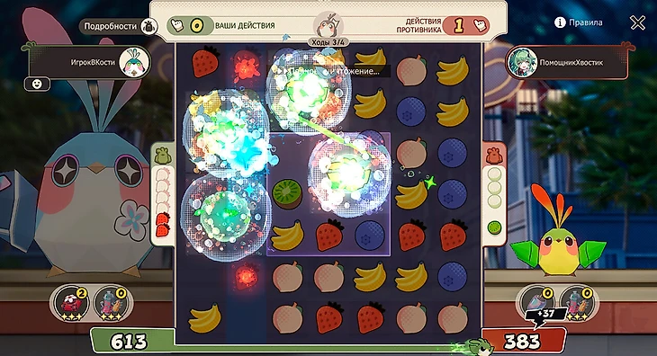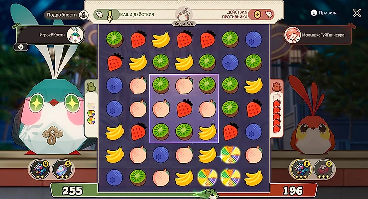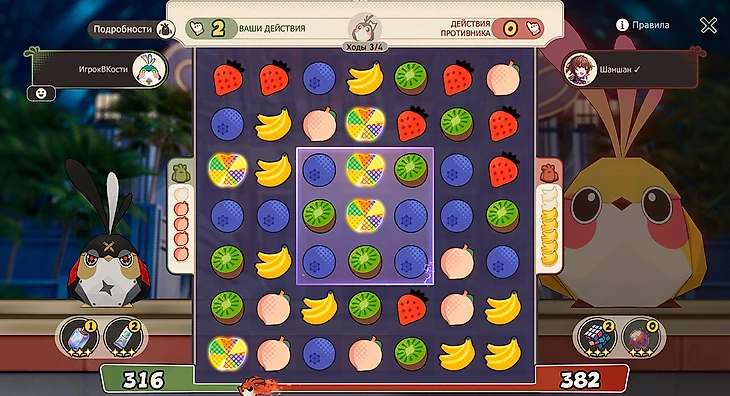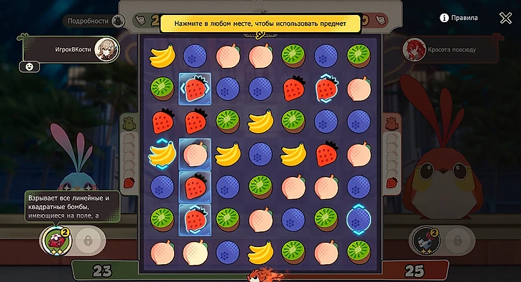 На поле появляется фиолетовая клетка – зона усиления, в которой уничтожение фруктов дает больше очков. А линейные и квадратные бомбы улучшаются до супербомб в начале хода, поэтому старайтесь не оставлять их сопернику.