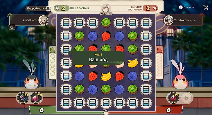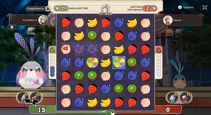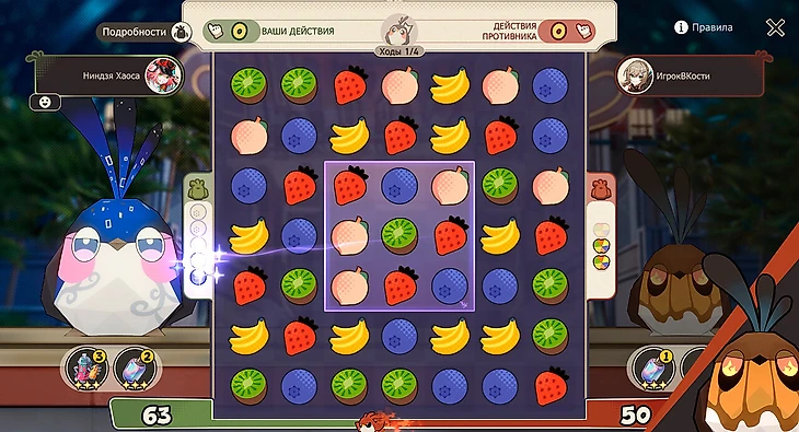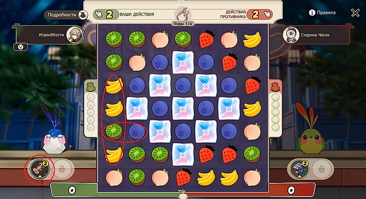 В обучающем бою игра сделает почти все за вас – необходимо только нажимать на выделенные клетки. В этом сражении нужно взять Яшмушку или Первопролетца и взрывать в первую очередь те фрукты и ягоды, которые отмечены слева от поля. Для Яшмушки это черника, для Первопролетца – киви.