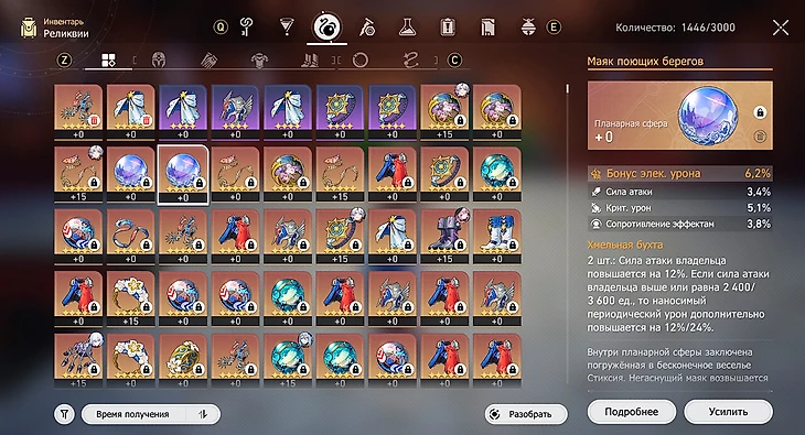 При фарме этого сета можно сразу отбрасывать сферы на мнимый, квантовый и ледяной урон, потому что механики этих типов не наносят периодического урона. Ищите в дополнительных характеристиках силу атаки в процентах, скорость и шанс попадания эффектов.