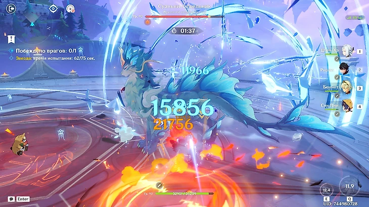 На этом этапе очень пригодится Фурина – ее звери умеют подниматься в воздух и атаковать его, пока он накапливает заряд. Также подойдут Гидро и Крио лучники: Тарталья, Гань Юй, Е Лань, Сиджвин или Диона. Не обязательно брать основного дамагера-лучника, но обязательно стоит взять основного дамагера Гидро стихии, чтобы снимать щит.