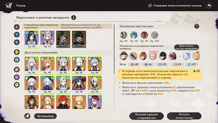 Саб-дпс: Сян Лин, Эмилия, Гань Юй через ульту, Кэйа, Эскофье, Е Лань, Син Цю, Фурина.