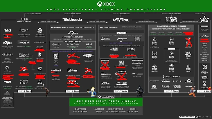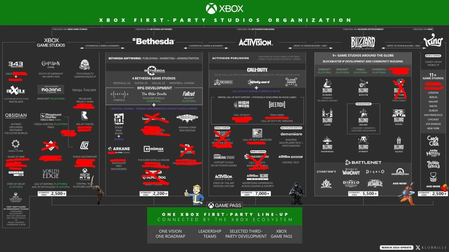 лишилось около двух тысяч человек из более чем десяти студий, в том числе Rare, Blizzard, Raven Software, ZeniMax Online Studios и других;
