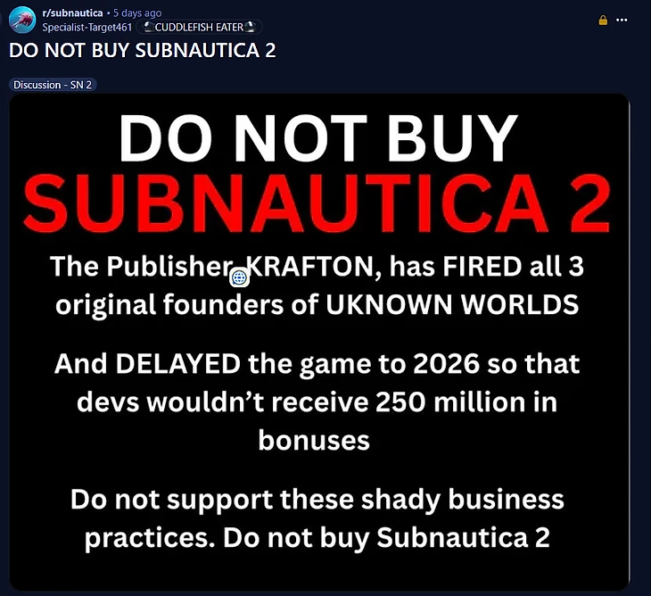Subnautica 2 должна была выйти в ранний доступ в 2025 году. Этим занималась студия Unknown Worlds, которую южнокорейская Krafton (создатели PUBG) купила еще в 2021 году. Тогда же Krafton пообещала $250 миллионов сверху в виде бонусов за успехи.