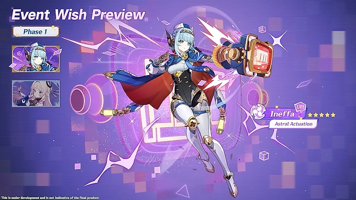 Инеффа использует новую элементальную реакцию «Лунный заряд», которая усиливает урон отряда при взаимодействии Электро и Гидро. Ее элементальный навык создает щит и призывает робота Биргитту, наносящего Электро урон по площади. Взрыв стихии трансформирует Биргитту в боевую машину, выпуская ракетный кулак с мощным Электро уроном.