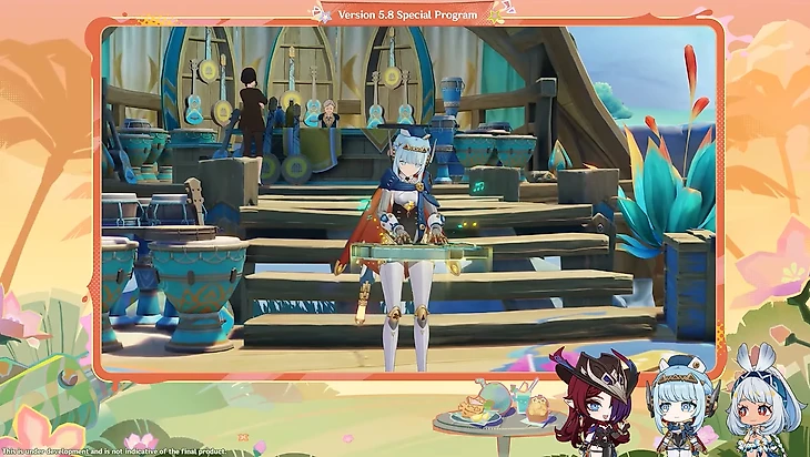 Например, на локации появится Беннет в новом костюме, который можно получить за участие в событиях курорта. Также нам встретится Венти, который приехал повидаться с другом, и хиличурлы, построившии собственный «курорт» из украденных материалов.