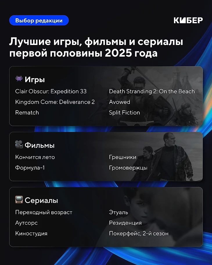 Первая половина 2025 года вышла яркой на события. Редакция Кибера внимательно следила за новинками и рассказывает про самые интересные игры, фильмы и сериалы за полгода.