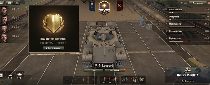 Постепенно мой уровень игры стабилизировался – я больше не феерил, но и не погибал за минуту. В итоге даже откалибровался на ранг «Золото 1». Выше – лишь «Чемпион» и «Легенда», ниже – «Серебро», «Бронза» и «Железо». До гения «Мира Танков» мне далеко, но в глубине души за скилл приятно.