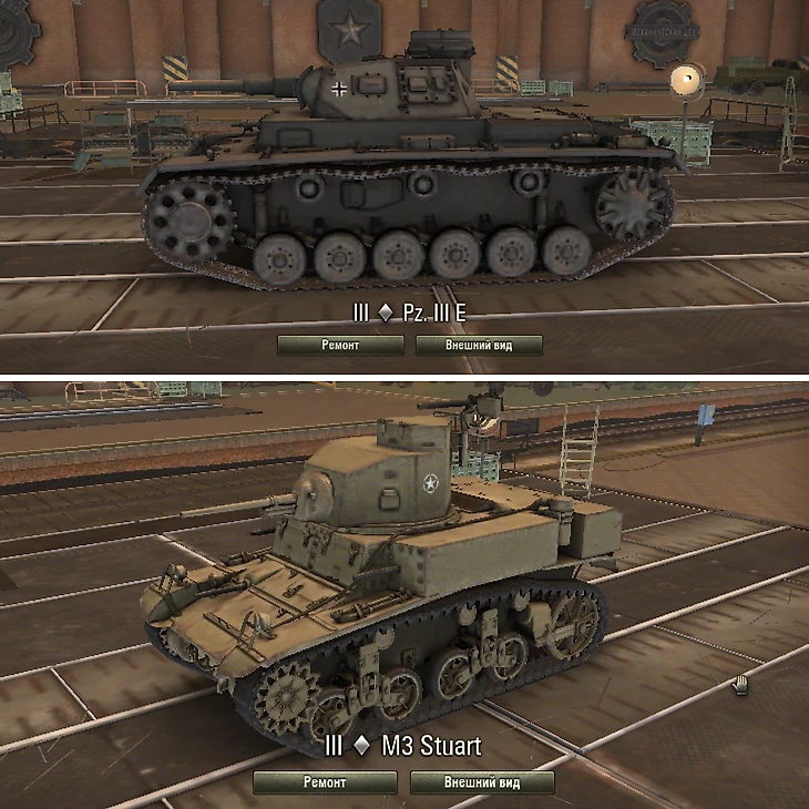 Со старта каждый игрок получает три танка третьего уровня: советский, немецкий и американский. Советский выглядит очень классно, будто профессор института танковых войск – с очками и воротничком. Немецкий – классика метала, словно сошел с обложки Iron Maiden. А вот американский – настоящий пыжик.