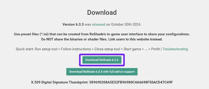 Начните загрузку: в разделе загрузок страницы нажмите кнопку «Download ReShade», после чего начнется сохранение файла установки.