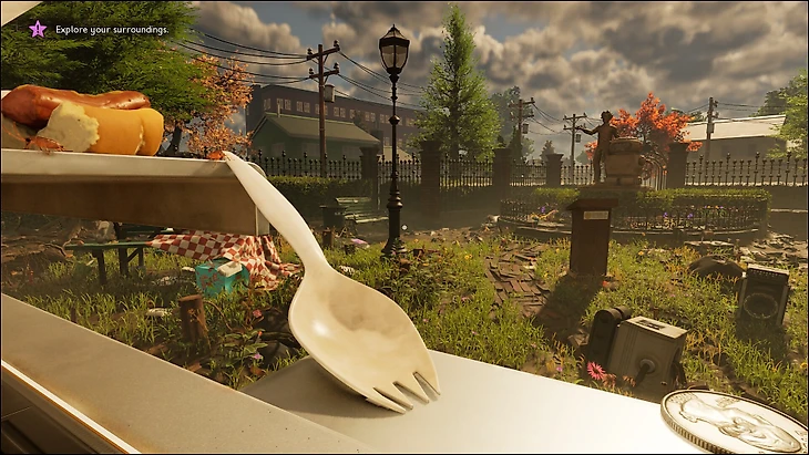 На соседнем столе валяется недоеденный хот-дог. Вы могли бы питаться им несколько лет, однако блюдо уже забронировано. По нему ползает армия жуков, пауков и прочих букашек. С такой толпой герою ваших размеров лучше не связываться. А жаль, между столами как раз перекинута пластиковая ложка. Кто-то просто неуклюже ее бросил, а вам она кажется величественным мостом.