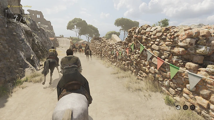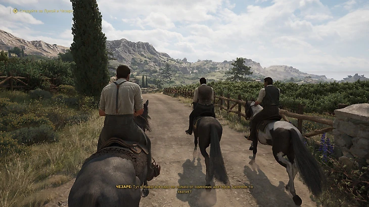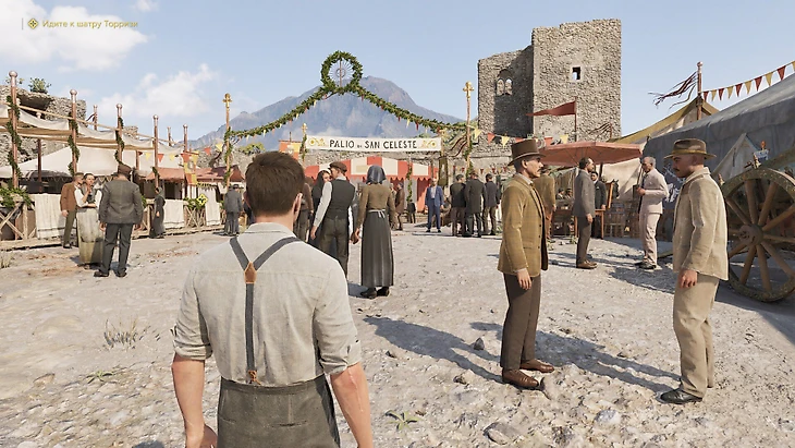 Новую «Мафию» не назвать технологичной, но благодаря дизайну и сеттингу я скринил каждый кадр. Вот маленький городок, где жители предвкушают большой ежегодный праздник. Они тихо судачат о фаворите скачек, делают ставки и ведут торговлю – в общем, по-настоящему живут. Вот скромное поместье, которое поставляет фрукты по всей округе. Повсюду раскиданы инструменты, трудяги вытирают пот и возвращаются к сбору, а помещения забиты ящиками с фруктами. А вот простая дорога: справа густой лес, слева деревушка с суетящимся народом, а впереди заснеженные вершины. Если обернетесь, вообще обнаружите полуразрушенный замок, что возвышается над округой и кажется гостем из другой эпохи.