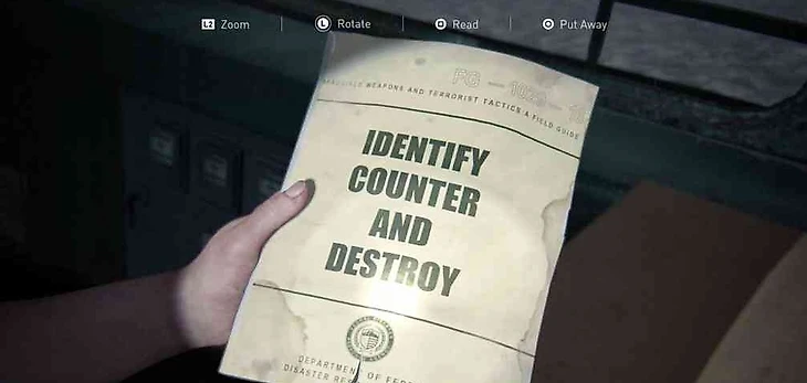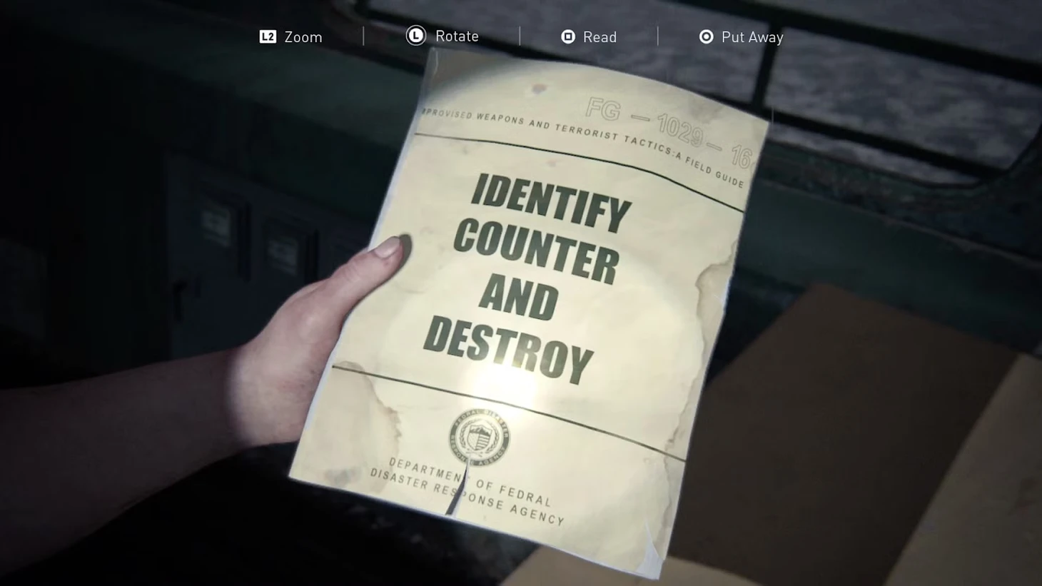 Самое первое руководство, которое вы сможете обнаружить в процессе игры, появляется в главе «Центр города» (Сиэтл, день 1, Глава 9). Добраться до него несложно: просто двигайтесь на север, пока не увидите разрушенный мост. Он находится между 6-й и 7-й авеню. Дальше нужно найти пожарную машину – она совсем близко к мосту. Забирайтесь на припаркованный военный грузовик, а уже с него прыгайте на пожарку. Дальше вам нужно взять пожарный шланг и сбросить его вниз с моста, в ту зону, где лежит еще один грузовик, но уже перевернутый. Спускайтесь по шлангу вниз и залезайте внутрь этого грузовика. Внутри вы и обнаружите первое руководство.
