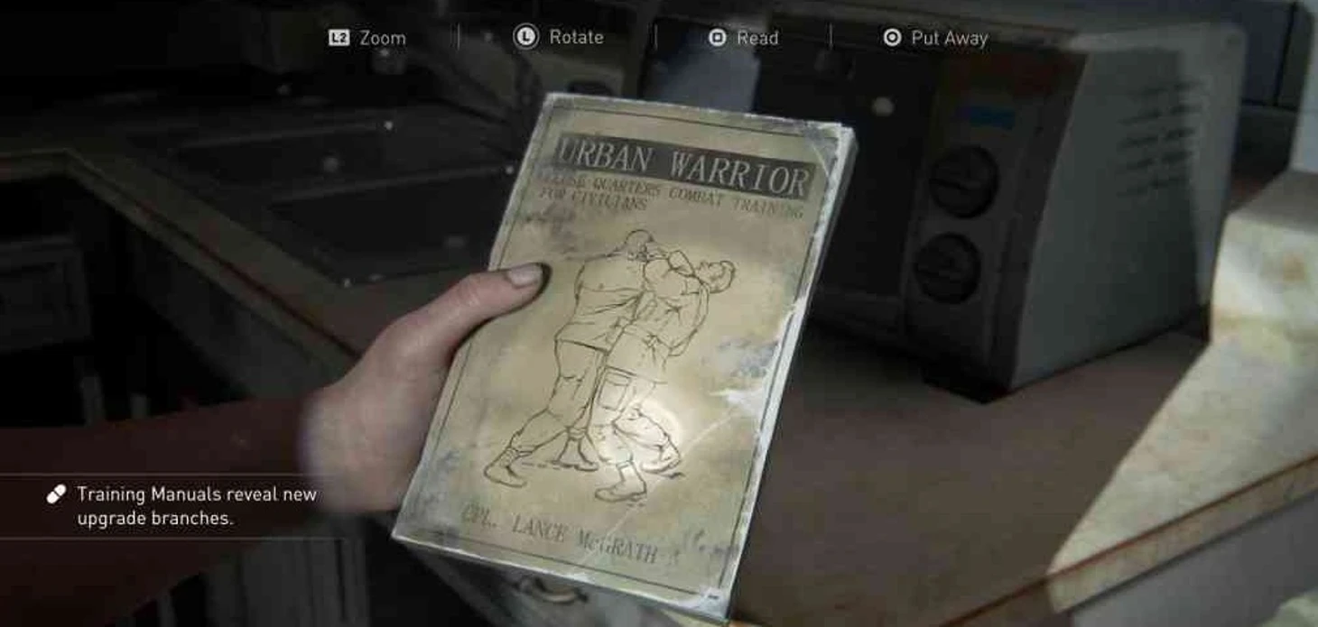 Шестым по счету пособием становится «Ближний бой». Найти его можно во время прохождения главы «Территория врага» (Сиэтл, день 1, Глава 28), когда вы играете за Эбби. В начале главы с вами будет Мэнни, но как только вы окажетесь одни, необходимо посмотреть вокруг. Ваш ориентир – магазин «Spicy Dumpling». Заходите внутрь и двигайтесь вперед к запасному выходу. Вы увидите еще один магазин – «Tang Fabrics & Imports», но туда вам не надо, ваша цель – разбитое окно слева. Залезайте внутрь и подбирайте с кухонного стола руководство.