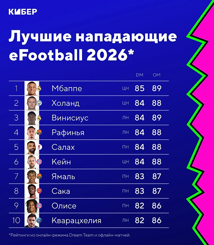 Килиан Мбаппе – лучший нападающий eFootball 2026. Форвард мадридского «Реала» обошел Эрлинга Холанда и получил самый высокий рейтинг «Команды мечты» до прокачки – 85, а в неофициальных матчах француз играет на 89 баллов. В офлайне рядом с ним только Винисиус (89).