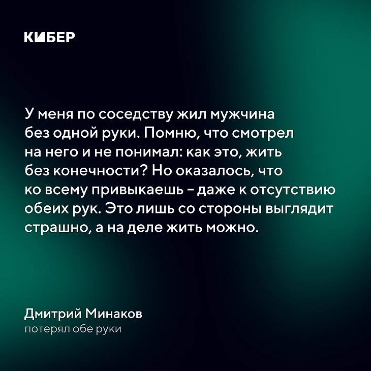 «У меня по соседству жил мужчина без одной руки. Помню, что смотрел на него и не понимал: как это, жить без конечности? Но оказалось, что ко всему привыкаешь – даже к отсутствию обеих рук. Это лишь со стороны выглядит страшно, а на деле жить можно».