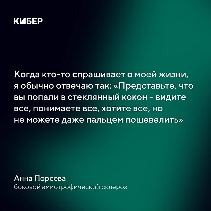 С Аней Порсевой я переписывался в день ее рождения и получал ответы, полные позитива, юмора и надежды. Трудно было поверить, что у Ани боковой амиотрофический склероз, болезнь Стивена Хокинга. Девушка привязана к постели, ее тело не работает. Но она общается, запускает стримы и играет с помощью взгляда.