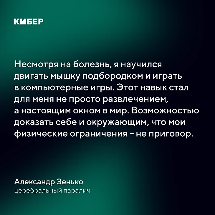 «Несмотря на болезнь, я научился двигать мышку подбородком и играть в компьютерные игры. Этот навык стал для меня не просто развлечением, а настоящим окном в мир. Возможностью доказать себе и окружающим, что мои физические ограничения – не приговор».